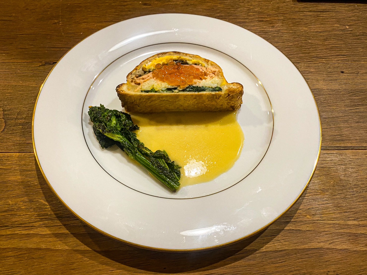さて、今回はサクラマスを使った1皿です。宮城県の郷土料理「はらこ飯」という親子丼の鮭バージョンのようなお料理をクーリビヤックという鮭のパイ包みにアレンジしてみました。クーリビヤックとはもともとはロシアの宮廷料理だったそうで非常にクラシックなお料理ですが、見た目が綺麗で事前に仕込んでおけば後は焼くだけですので、ホームパーティーなどにも最適です!